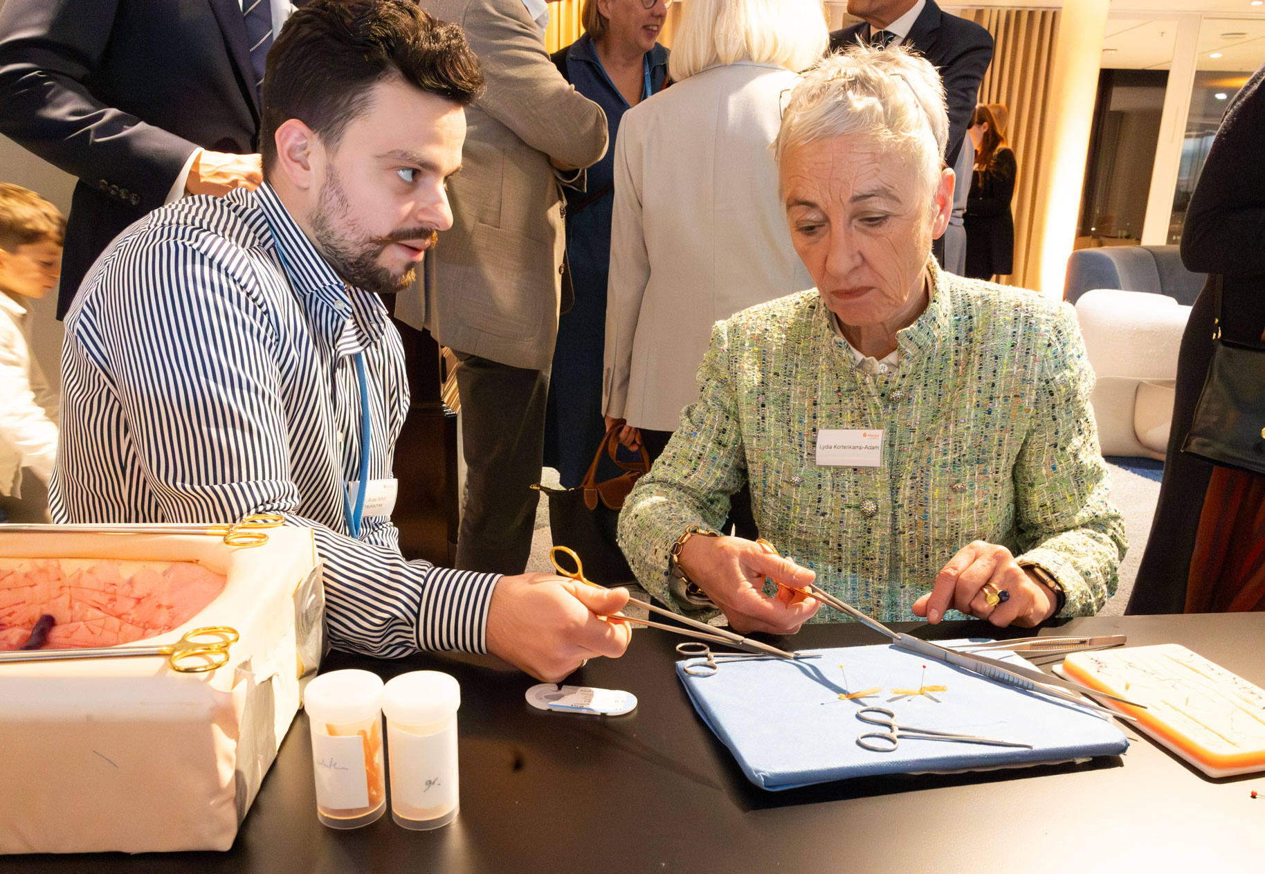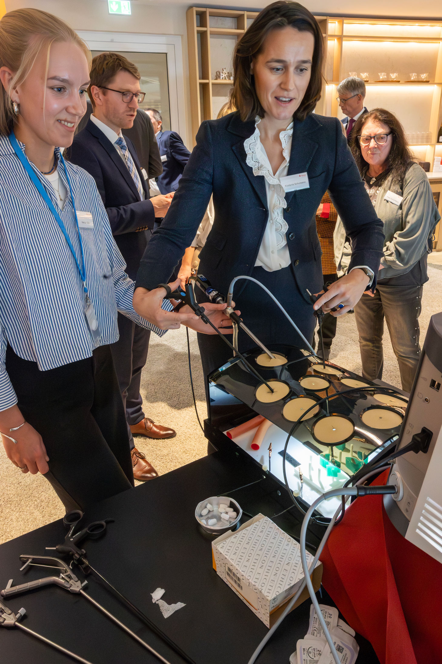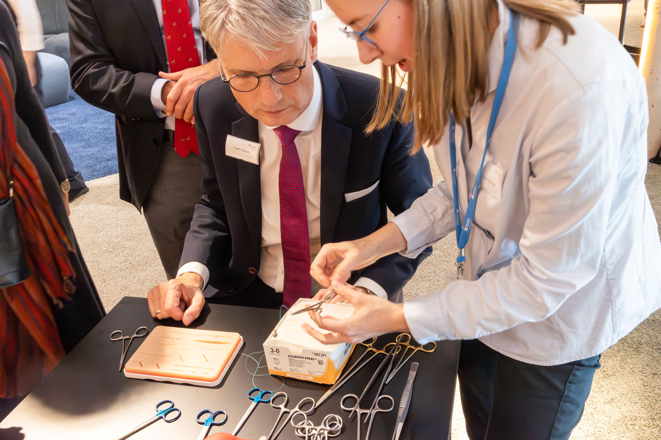 Nach der Theorie ging es in den praktischen Teil des Abends über. Das Highlight: Vier interaktive Stationen aus dem Skills Lab der Chirurgie. Hier konnten die Gäste selbst erleben, was medizinisches Können bedeutet – sie nähten, übten und staunten, wie präzise und feinfühlig die Arbeit der Chirurgen ist. Viele Gäste zeigten sich begeistert: „Die 3D-gedruckten Organmodelle aus Silikon sehen so lebensecht aus. Eine saubere Gefäßnaht erfordert schon viel Können und Konzentration,“ so Lydia Kortenkamp-Adam. Auch das chirurgische Training mit dem Laparoskop forderte den Gästen Geschicklichkeit und Geduld ab. Eveline Velten war froh, nicht mit „so dünnen Instrumenten“ arbeiten zu müssen. „Eine Operation mit einem Laparoskop ist für Patienten bestimmt gut, aber sie muss schon von erfahrenen Chirurgen mit entsprechender Expertise durchgeführt werden. „