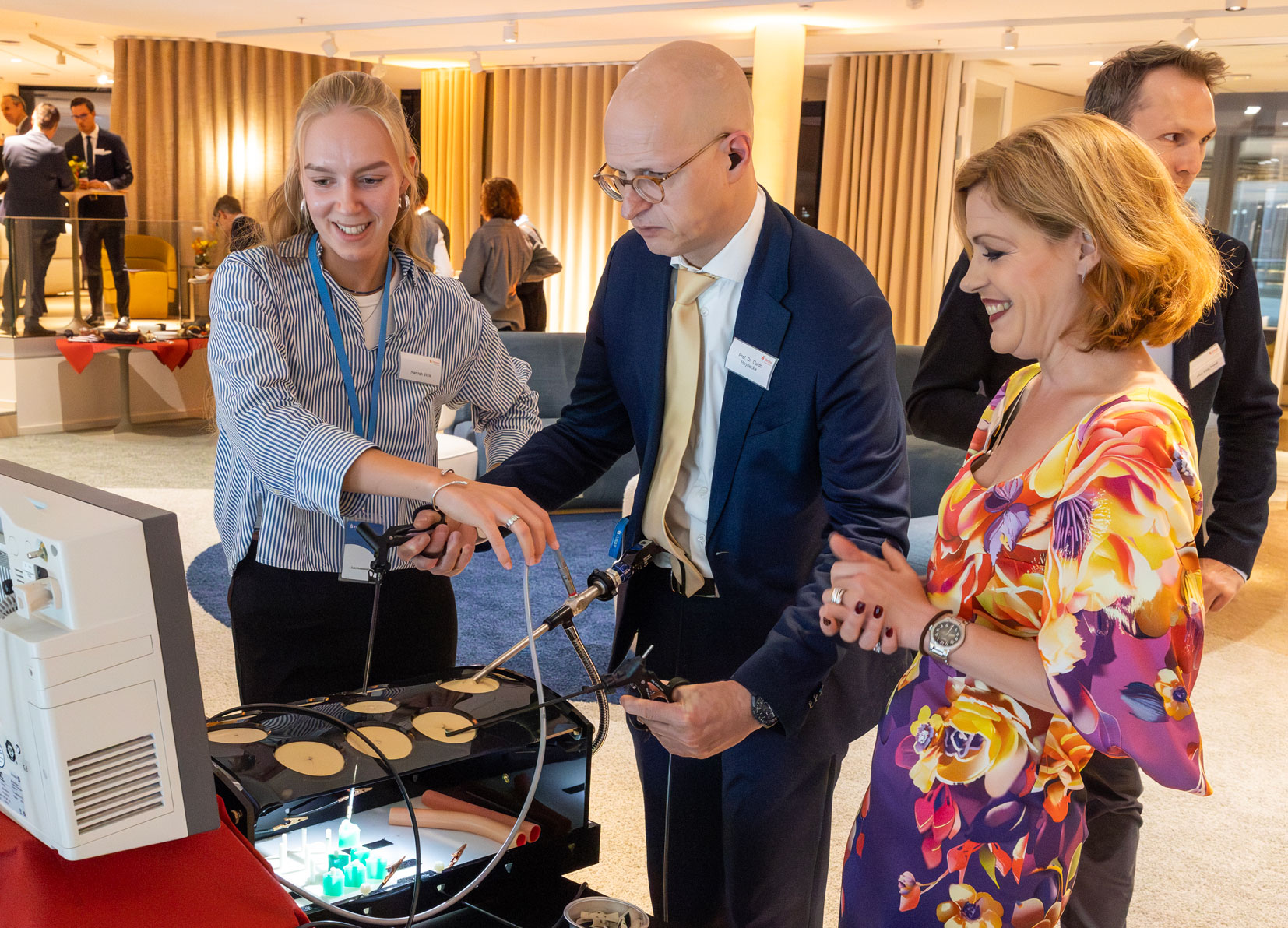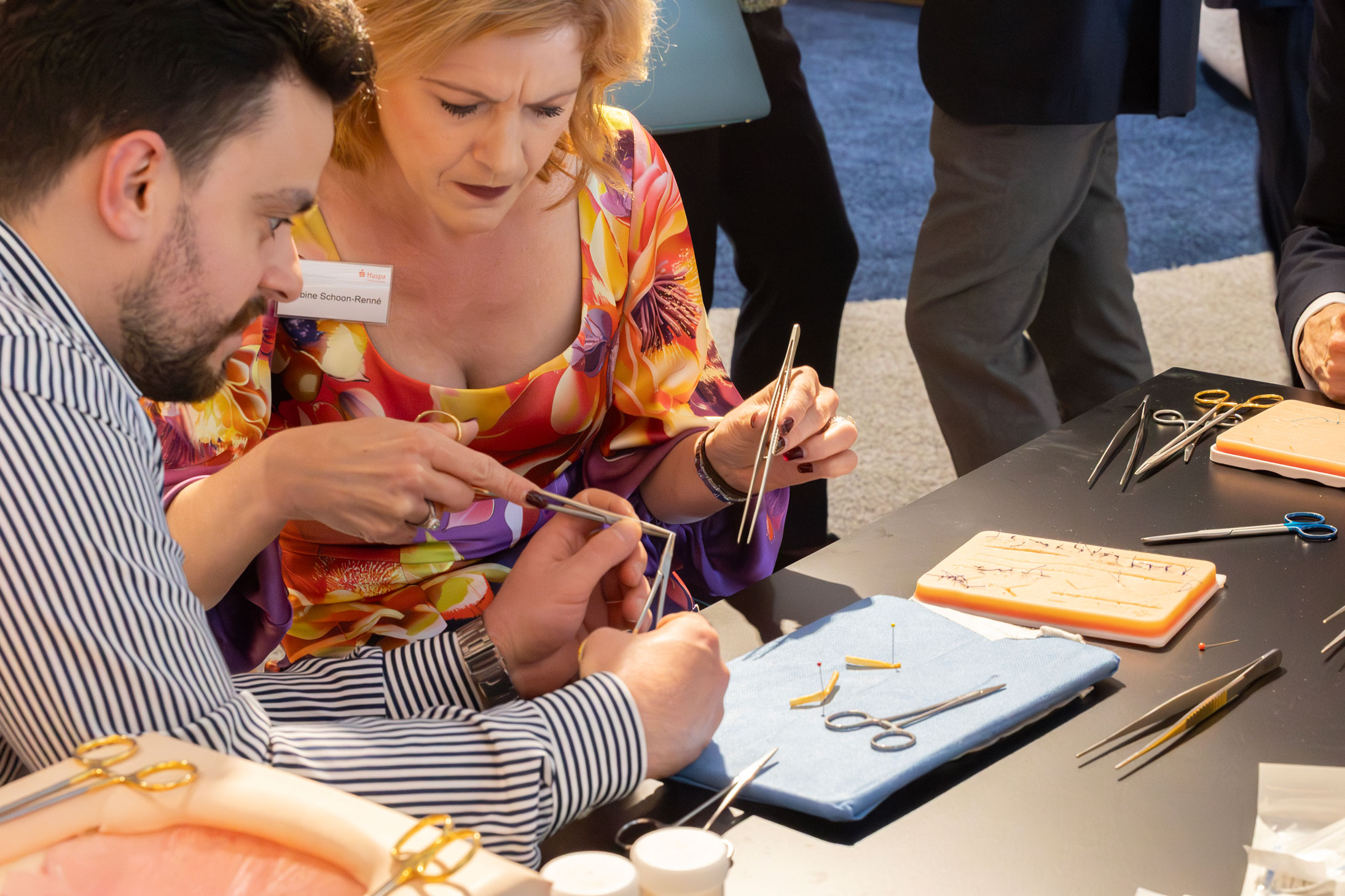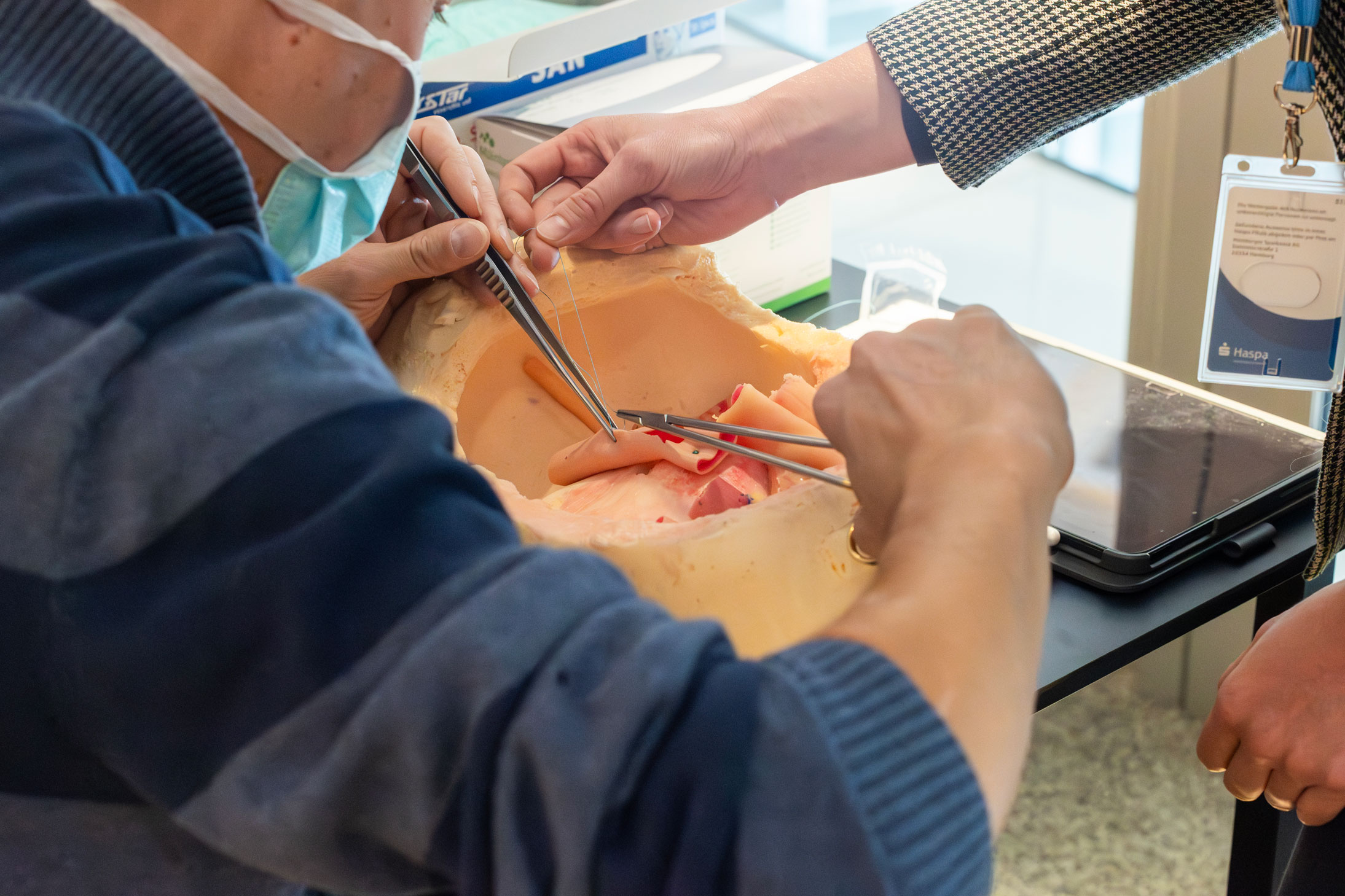 Nach der Theorie ging es in den praktischen Teil des Abends über. Das Highlight: Vier interaktive Stationen aus dem Skills Lab der Chirurgie. Hier konnten die Gäste selbst erleben, was medizinisches Können bedeutet – sie nähten, übten und staunten, wie präzise und feinfühlig die Arbeit der Chirurgen ist. Viele Gäste zeigten sich begeistert: „Die 3D-gedruckten Organmodelle aus Silikon sehen so lebensecht aus. Eine saubere Gefäßnaht erfordert schon viel Können und Konzentration,“ so Lydia Kortenkamp-Adam. Auch das chirurgische Training mit dem Laparoskop forderte den Gästen Geschicklichkeit und Geduld ab. Eveline Velten war froh, nicht mit „so dünnen Instrumenten“ arbeiten zu müssen. „Eine Operation mit einem Laparoskop ist für Patienten bestimmt gut, aber sie muss schon von erfahrenen Chirurgen mit entsprechender Expertise durchgeführt werden. „
