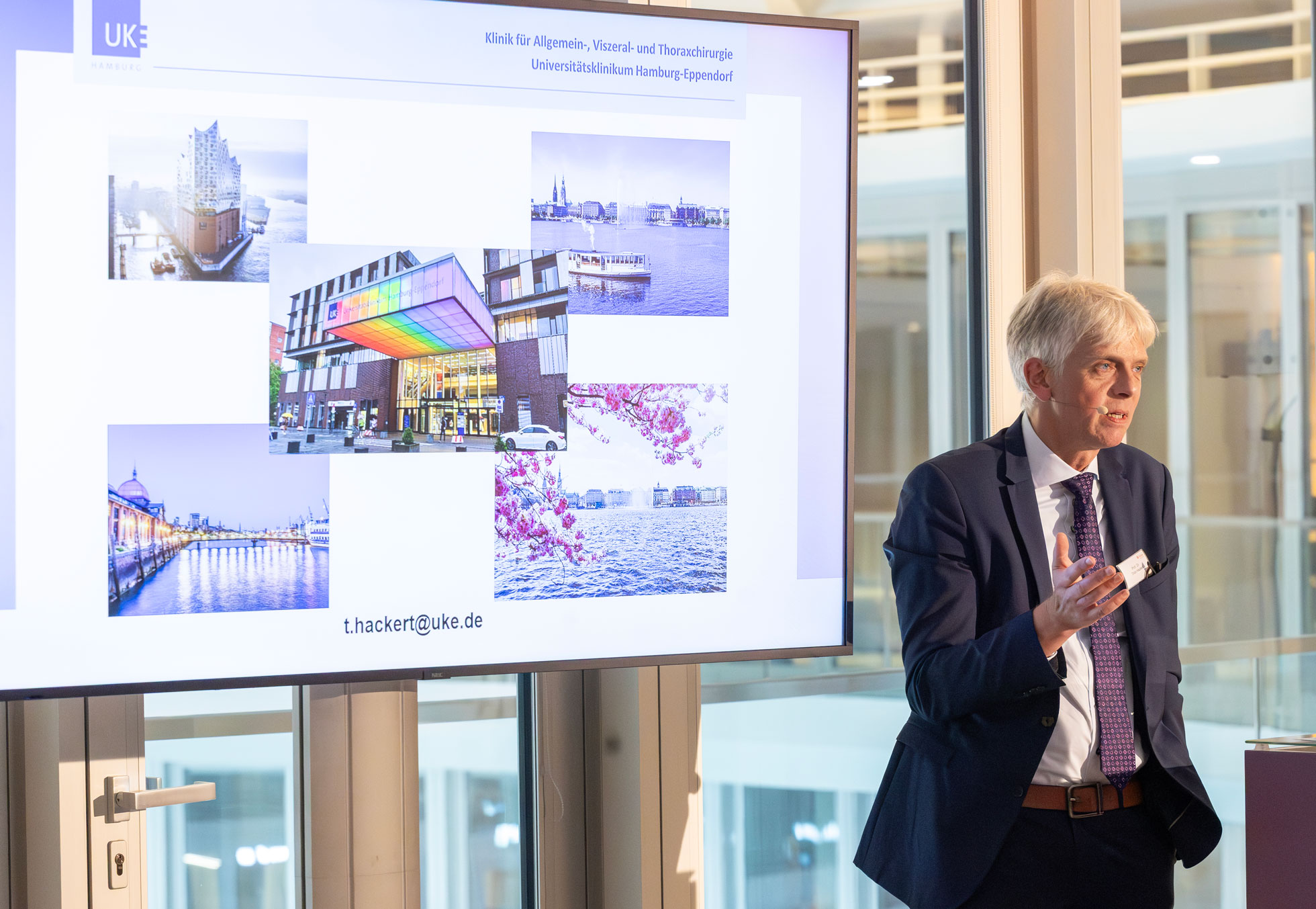 Unter dem Motto „Wie finde ich einen guten Chirurgen“ erhielten die Gäste von Prof. Dr. Thilo Hackert, Direktor der Allgemein-, Viszeral- und Thoraxchirurgie, einen anschaulichen Blick in die Zukunft der Chirurgie. Besonderes Augenmerk richtete er auf die neuen Entwicklungen wie der Einsatz von Robotik und Künstlicher Intelligenz.
