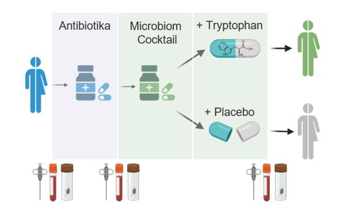 Erste Ergebnisse zeigen: Bestimmte Abbauprodukte des Eiweißbausteins Tryptophan, die von der Mikrobiota gebildet werden, können das Immunsystem gezielt regulieren und Entzündungen im Darm reduzieren. Auf dieser Basis wurde eine klinische Studie gestartet, in der eine Kombination aus Antibiotika, Probiotika und Tryptophan getestet wird – unter streng kontrollierten Bedingungen.